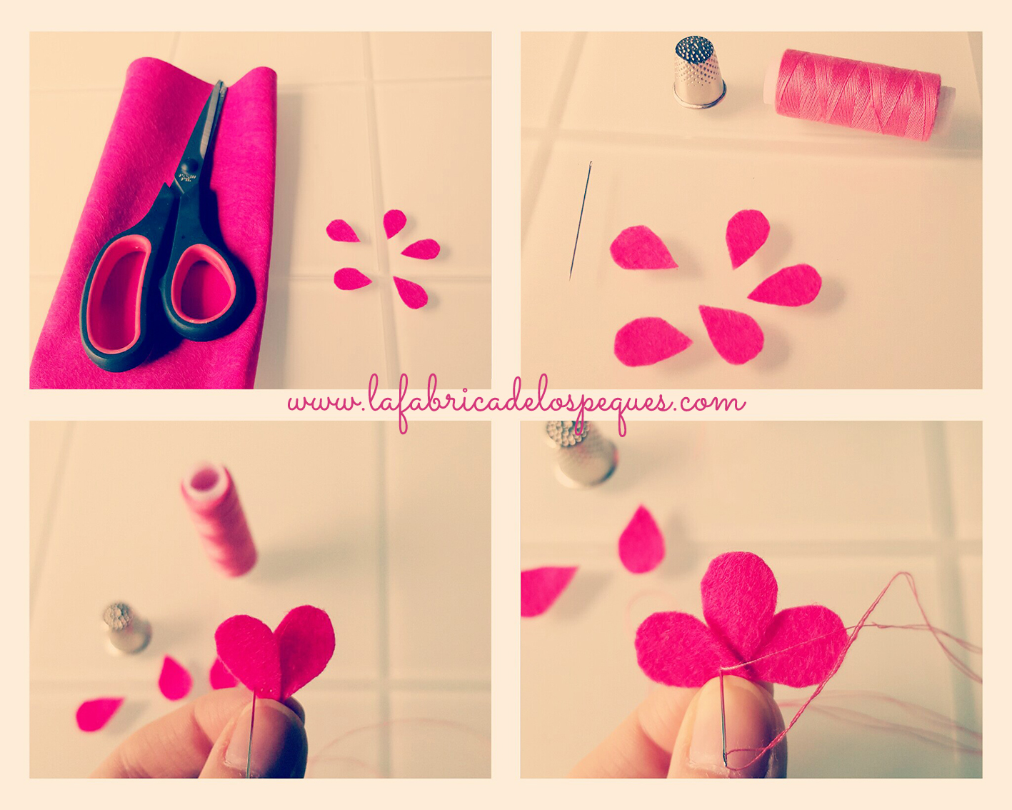 3. Recorta las distintas formas y cóselas. En mi caso, he elaborado una flor y un corazón. En la primera, la parte central es un botón amarillo. Y ahí es donde he cosido los pétalos y el clip. En el caso del corazón, he utilizado dos tamaños diferentes. Después, los he cosido entre sí, y por la parte de atrás, con el clip.