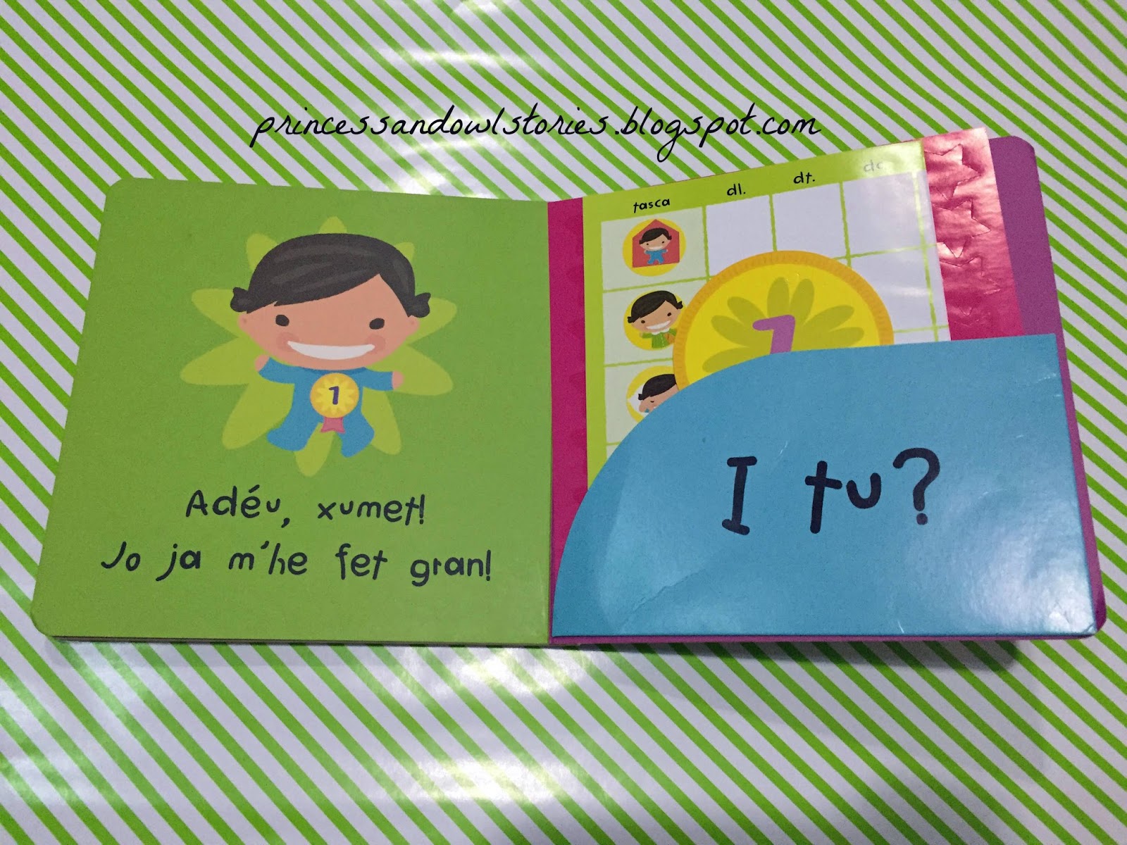 A Princess le pasó como a mí con este cuento: nada más verlo le llamó mucho la atención. La verdad es que las ilustraciones son preciosas y tiene unos colores muy vivos y un tacto muy pero que muy agradable. El primer día que lo tuvimos creo que se lo conté unas 20 veces seguidas. Ahora hemos bajado la frecuencia a una por día, pero se lo sabe ya de memoria. Le hace mucha gracia como Tula, la protagonista se hace mayor y el chupete se le queda pequeño, incluso como se deshace de él. Pero de dejar el chuepete ella ni hablamos. Tula sentencia el cuento con la frase “Adiós, chupete. Yo ya soy mayor, ¿y tu?” a lo que Princess siempre me responde “Petita!” (“Pequeña”) y se pone el chupete corriendo. Yo se lo cuento cada día, también porque ella así lo pide, para ver si algo cala en ella, jejejeje, pero creo que de momento no tengo suerte.