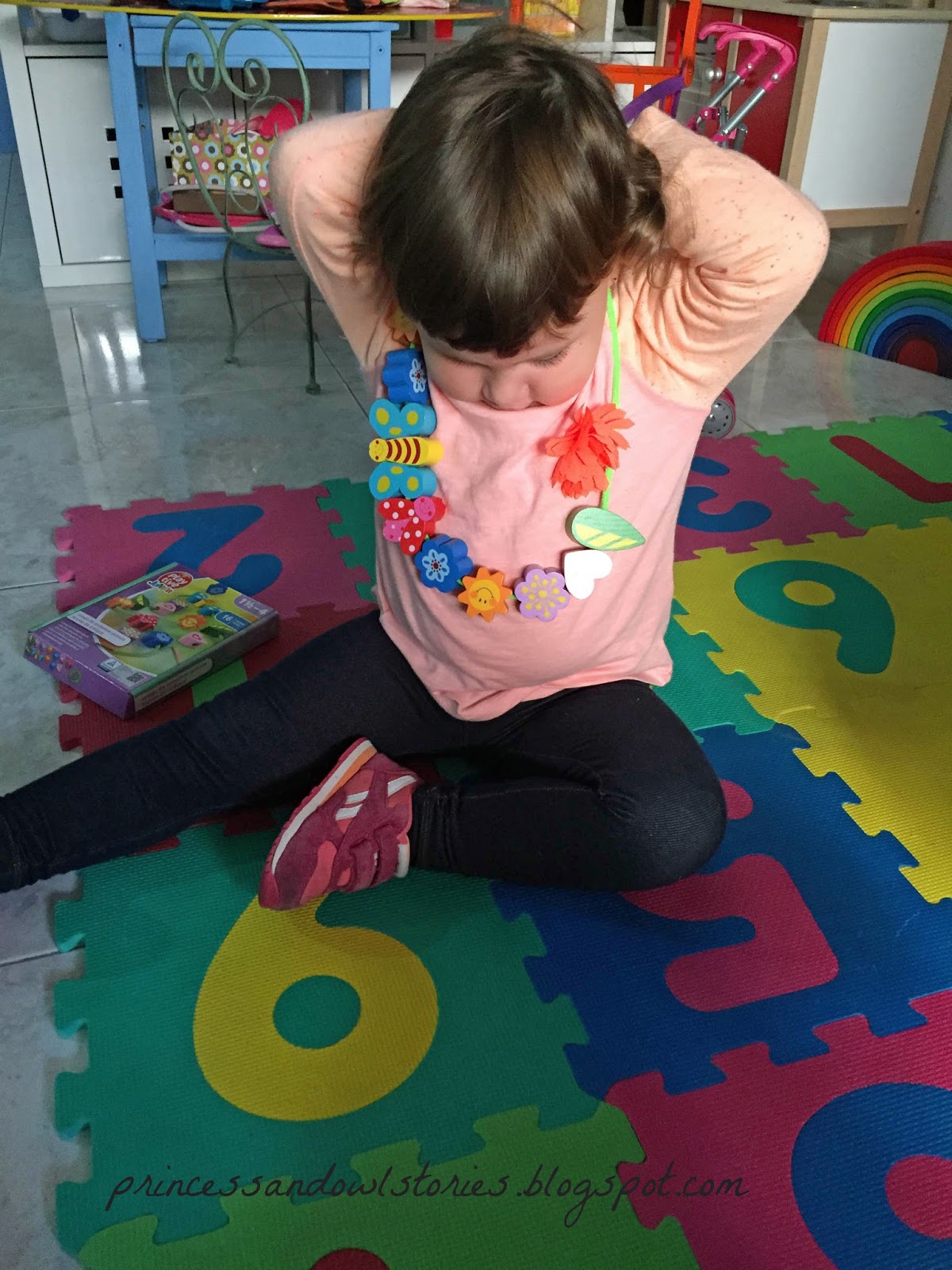 ¡Lo que yo no me podía ni imaginar era que le iba a gustar tanto! Se pasó dos horas enteras montando y desmontando, enhebrando y desenhebrando piezas, haciendo creaciones y probándose los collares y guirnaldas que le salían. “¡Mira este qué bonito mami!” Y así todo lo que quedaba de tarde. Ahora es ella sola la que me pide el “juego de los collares” y aunque al principio le costó un poco lo de meter el cordón por los agujeritos de madera, ya es toda una experta enhebrando.