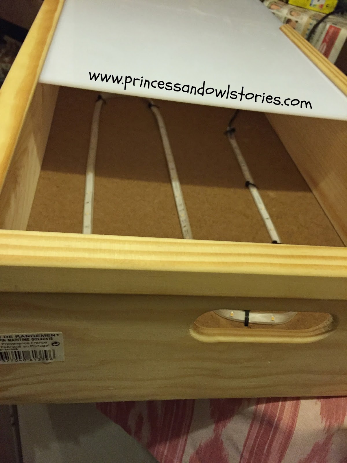 Una vez terminado, podemos decorar el cajón de luz a gusto del consumidor. Nosotros, de momento, lo dejamos así. Ya decidirá Princess cuándo y cómo quiere decorarlo. Y te cuento también que hemos hecho un cajón, y no una mesa, por su practicidad: es más pequeño, puedes