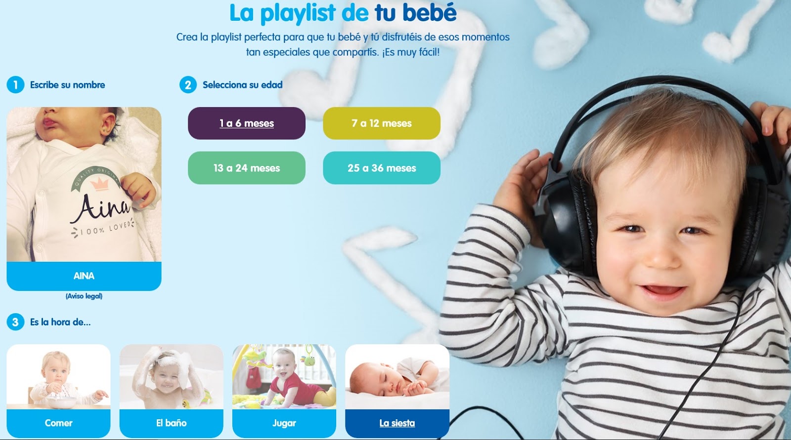 Han creado una web, nestlebebe-spotify.es, dónde puedes personalizar playslists en función de la edad de tu peque y el momento del día en que se la vayas a poner. El proceso es muy sencillo: inserta una foto y el nombre de tu bebé (esto es opcional), elige su franja de edad y el momento del día en el que se la vas a poner.