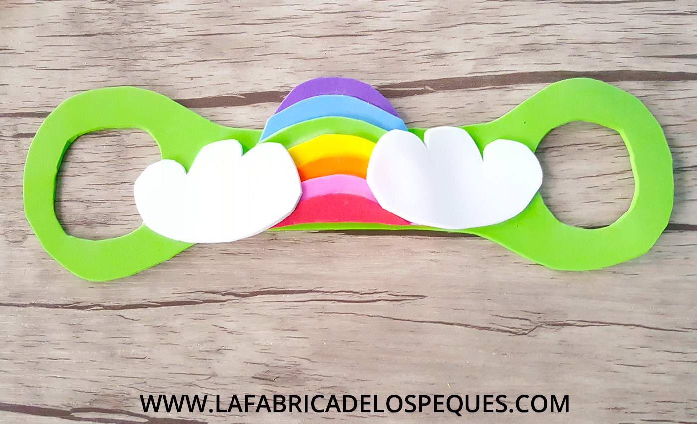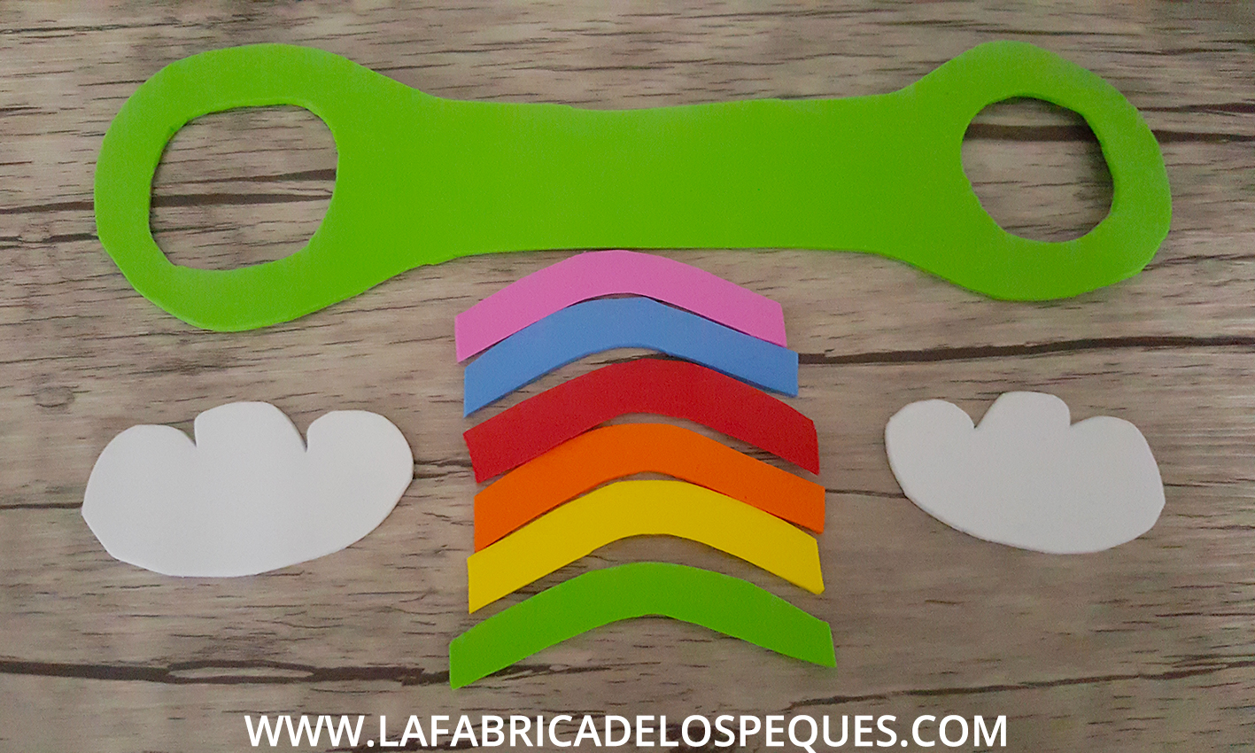 En segundo lugar, simplemente, hay que recortar la forma de goma eva que queramos, y pegarla sobre la base. En este caso, he elaborado un protector con dos patitos, y otro con un arcoíris y unas nubes. Primero, he recortado las partes. Y después, las he pegado entre sí. Y….¡Este es el resultado!